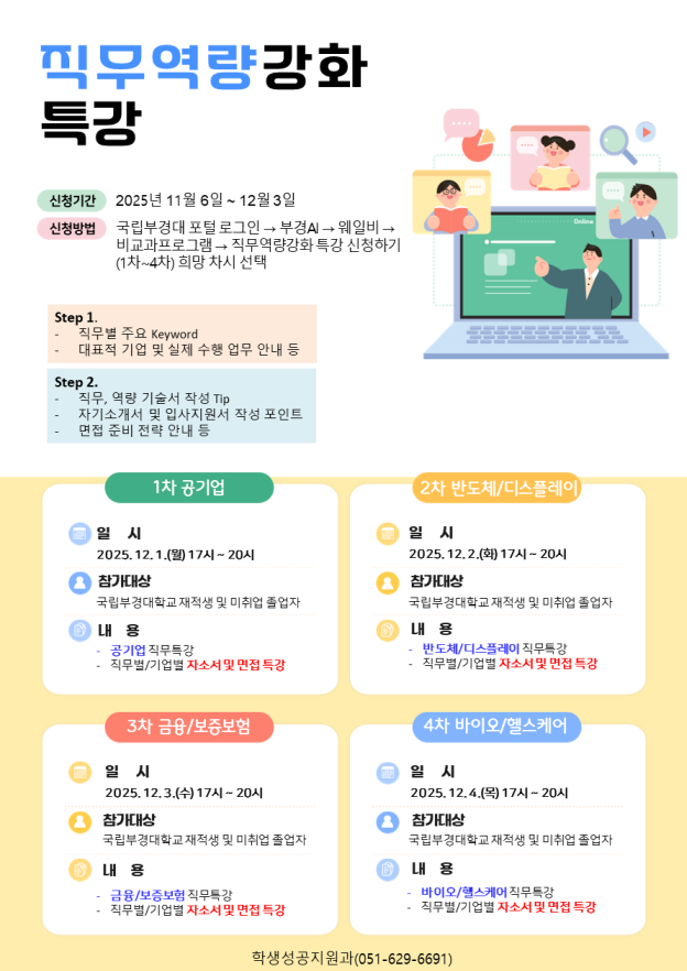 마. 신청방법:【국립부경대포털-부경AI-비교과(웨일비)】를 통한 온라인 신청 https://portal.pknu.ac.kr ? 로그인 ? 부경AI ? 비교과(웨일비) ? 비교과 프로그램 ? 2025년 국립대학육성사업 여대생특화프로그램「직무역량강화 특강」1~4차(선택)