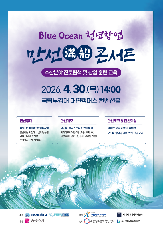 2026 Blue Ocean 청년창업 만선 콘서트 안내 해양수산 산업 분야의 유기적 협력체계 구축과 청년층의 관심 및 참여 확대를 위해「2026 Blue Ocean 청년창업 만선(滿船) 콘서트」를 개최하오니 많은 참여 바랍니다. 가. 행 사 명: 2026「Blue Ocean 청년창업」만선(滿船) 콘서트 나. 행사일시: 2026. 4. 30.(목) 14:00 ∼ 18:00 다. 행사장소: 국립부경대학교 대연캠퍼스 부경컨벤션홀 라. 참석대상: 부산지역 대학(원)생, 예비 및 초기창업자 등 150명 내외 마. 운영내용: 수산분야 진로탐색 및 창업 훈련 교육, 성공사례 공유 및 네트워킹 운영 등