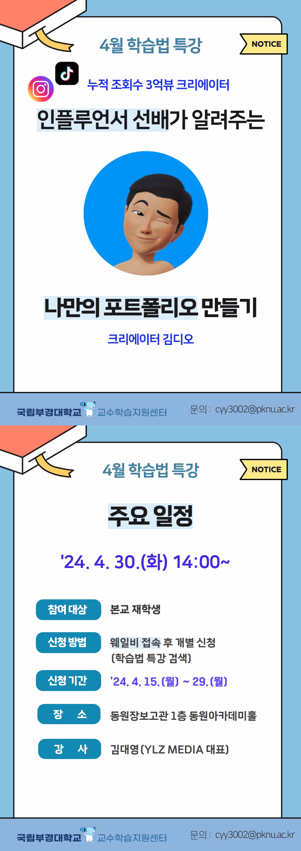 2024학년도 4월 학습법 특강 [인플루언서 선배가 알려주는 나만의 포트폴리오 만들기] 안내