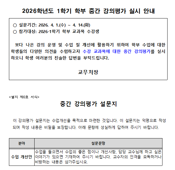 | 2026학년도 1학기 학부 중간 강의평가 실시 안내 | |||