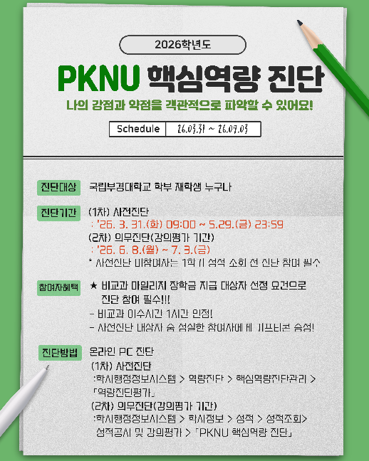 2026학년도 PKNU 핵심역량 진단 실시 안내 우리 대학 학부재학생의 핵심역량 수준을 진단하고, 교육과정의 환류ㆍ개선을 위한 객관적 지표를 마련하기 위해 「2026학년도 PKNU 핵심역량 진단」을 실시하고자 하니 학생들의 적극적인 참여 바랍니다. 가. 진단대상: 본교 학부재학생 나. 진단기간 - (1차) 사전진단: 2026. 3. 31.(화) 9:00 ~ 5. 29.(금) 23:59까지 - (2차) 의무진단*(강의평가 기간): 2026. 6. 8.(월) ~ 7. 3.(금) * 사전 진단 미참여자 대상으로 강의평가 시 핵심역량 진단평가 의무 실시 다. 진단방법: 온라인 PC 진단(소요시간 10분 내외) - (1차) 사전진단: 학사행정정보시스템 → 역량진단 → 핵심역량진단관리→ 「역량진단평가」 - (2차) 의무진단: 학사행정정보시스템 → 학사정보 → 성적 → 성적조회 → 성적공시 및 강의평가 → 「PKNU 핵심역량 진단」 라. 참여자 혜택 - 비교과 이수시간: 1시간 인정(비교과 마일리지 1점) - 비교과 마일리지 장학금: 장학금 지급 대상자 선정 요건으로 진단 참여 필수 - (사전참여자 대상) 모든 문항 진단 완료자 중 추첨을 통하여 기프티콘 증정 ※ 기프티콘 증정은 사전진단 기간 종료 후 발송 예정(개인정보활용 동의 및 연락처 기재 필수)