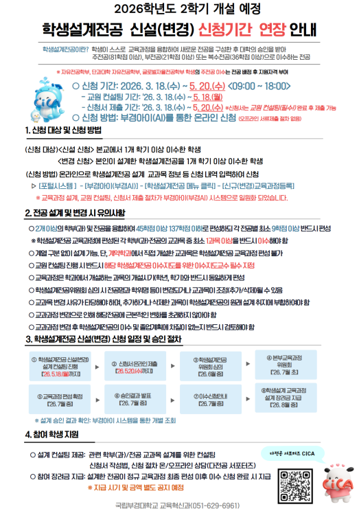 2026학년도 1학기 학생설계전공 신설(변경) 신청 기간 연장 안내 2026학년도 1학기 학생설계전공 신설(변경) 신청 기간 연장 사항을 아래와 같이 알려드리오니, 관심있는 학생은 기한 내 신청 바랍니다. 가. 연장사유: 학생설계전공 신설(변경) 추가 접수 나. 신청대상 - (신설) 본교에서 1학기 이상 이수한 학생 1인 또는 다수(편입생 동일) - (변경) 본인이 설계한 학생설계전공을 1개 학기 이상 이수한 학생 다. 신청기간: (당초) 2026. 3. 18.(수) ~ 4. 30.(목) → (변경) 2026. 3. 18.(수) ~ 5. 20.(수) - (교원 컨설팅 기간) 2026. 3. 18.(수) ~ 5. 18.(월) - (신청서 제출* 기간) 2026. 3. 18.(수) ~ 5. 20.(수) * 교원 컨설팅 완료 후 제출 가능 라. 신청방법: 온라인(부경AI) 신청[붙임1 안내문 참고] 마. (학과)신청승인: ~ 2026. 5. 22.(금) 18:00까지 ☞ [KORUS] -[학내링크] - [부경AI] - [관리자페이지] - [학생설계전공관리] - [학과승인 관리] 바. 참고사항 - (교원업적) 학생설계전공 설계 지도(2.6.) 및 다전공 이수 지도(2.7.) 실적 반영 → 최대 5점 ※ (학생설계전공 설계 지도) 1건당 1점, (다전공 이수 지도) 1건당 0.2점 - (학과평가) 학생설계전공 주관?참여학과에 평가점수 부여 → 최대 3점 사. 추진 일정 ※ 교육과정 편성 심의는 주관 단과대학 및 교무과와 협의 후 진행 예정