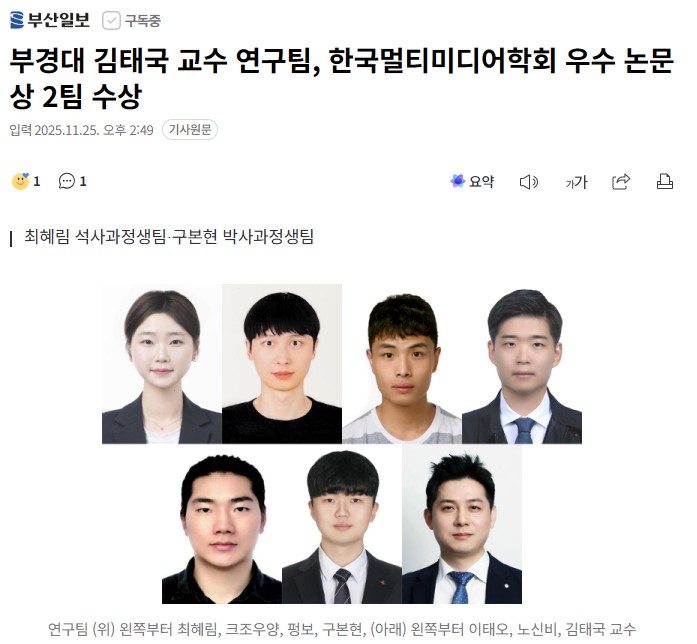 안녕하세요. 연구실에 석사, 박사, 학사 학생들이 작성한 논문이 2025년 한국멀티미디어학회 추계학술대회에서 우수논문상을 수상하였습니다. 대학원 컴퓨터공학과 구본현 박사과정(주저자), 대학원 인공지능융합학과 최혜림 석사과정(주저자) 축하합니다.