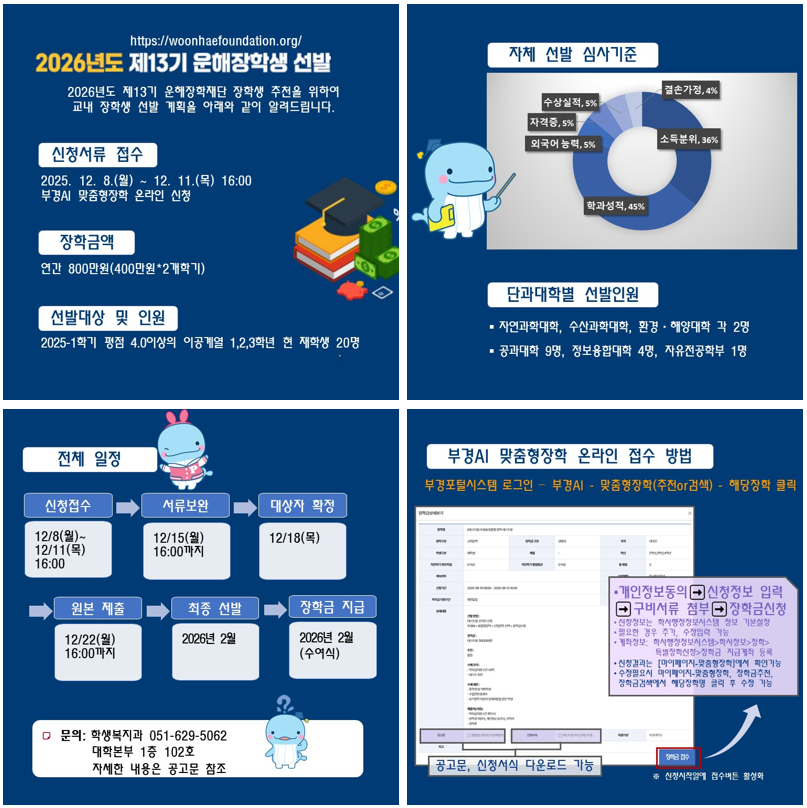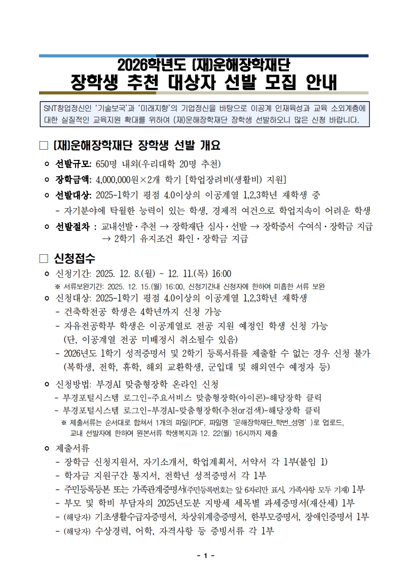 2026학년도 (재)운해장학재단 장학생 신청 안내