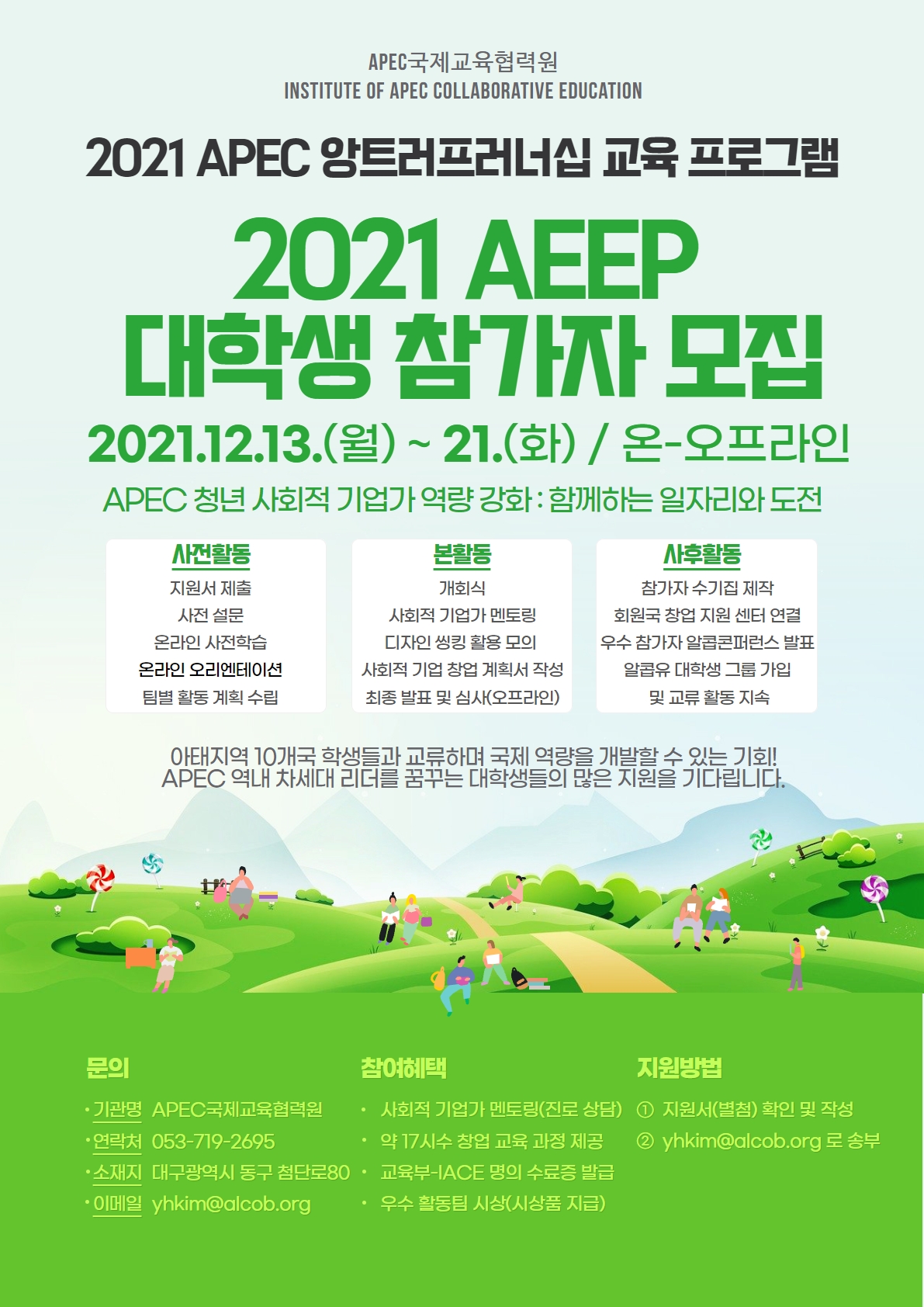 | 2021년도 APEC 앙트러프러너십 교육프로그랩(AEEP) 국내 대학생 참가자 선발 안내 | |||