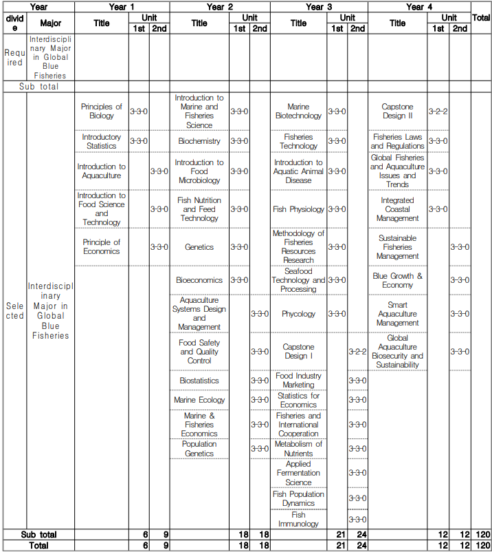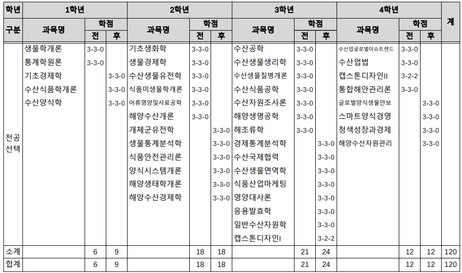수산과학대학 글로벌블루수산융합전공 교육과정(현)