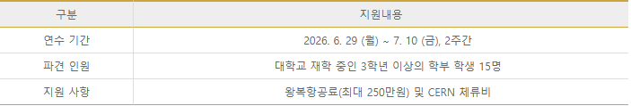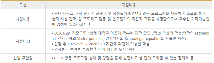 한국물리학회에서는 한국연구재단 과제「유럽핵입자물리연구소 (CERN : European Organization for Nuclear Research) 협력사업」의 일환으로 세계적인 입자물리연구소인 CERN에 2주간 파견되어 CERN Summer Workshop 참가, 시설 견학, 팀 프로젝트 활동을 수행할 대학생 선발 사업을 공고합니다. 2025년 12월 1일 I. 사업 개요 □ 사업 목적 ㅇ 박사후연구원과 박사과정 대학원생 파견, 교육 및 교류에 한정되어 있던 CERN과의 협력 분야를 대학교 재학 중인 학부 학생으로 확대 지원 ㅇ CERN에 방문하여 세계 최고 수준의 대형연구시설을 체험하고 연구진과의 교류를 바탕으로 향후 국내 과학기술발전을 선도할 우수 연구 인력 양성 □ 지원 대상
