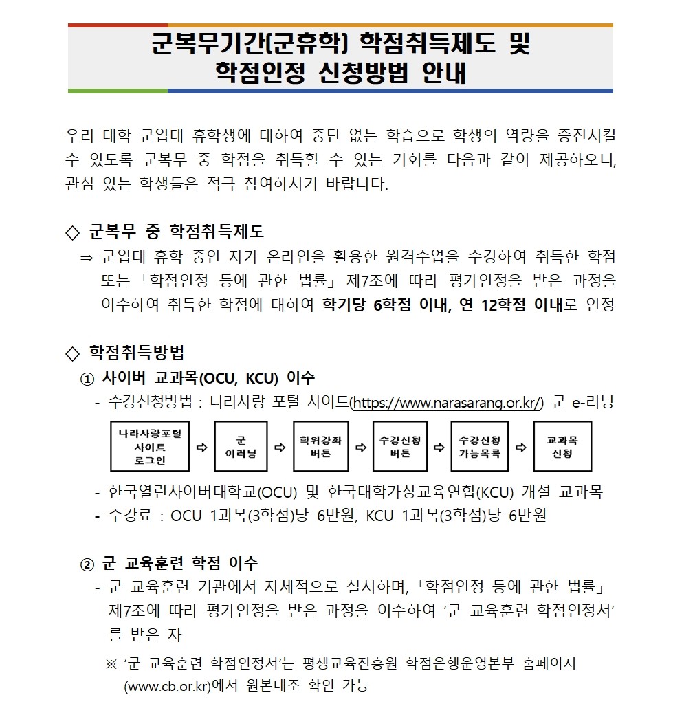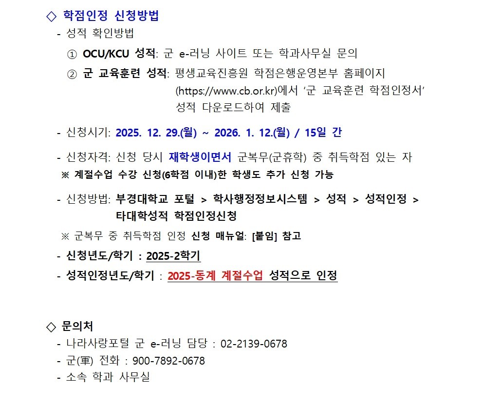 2025학년도 2학기 군복무자(군휴학자) 학점인정 신청 및 승인 안내