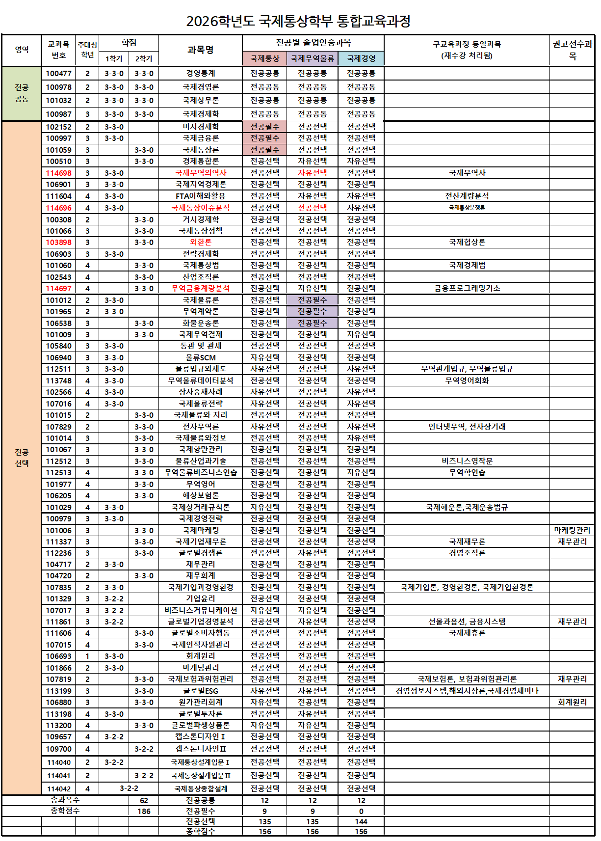 ※ 전공은 개설주관학과가 국제통상학부 교과목만 인정, 동일과목명이여도 타과 개설과목은 "전공 불인정"