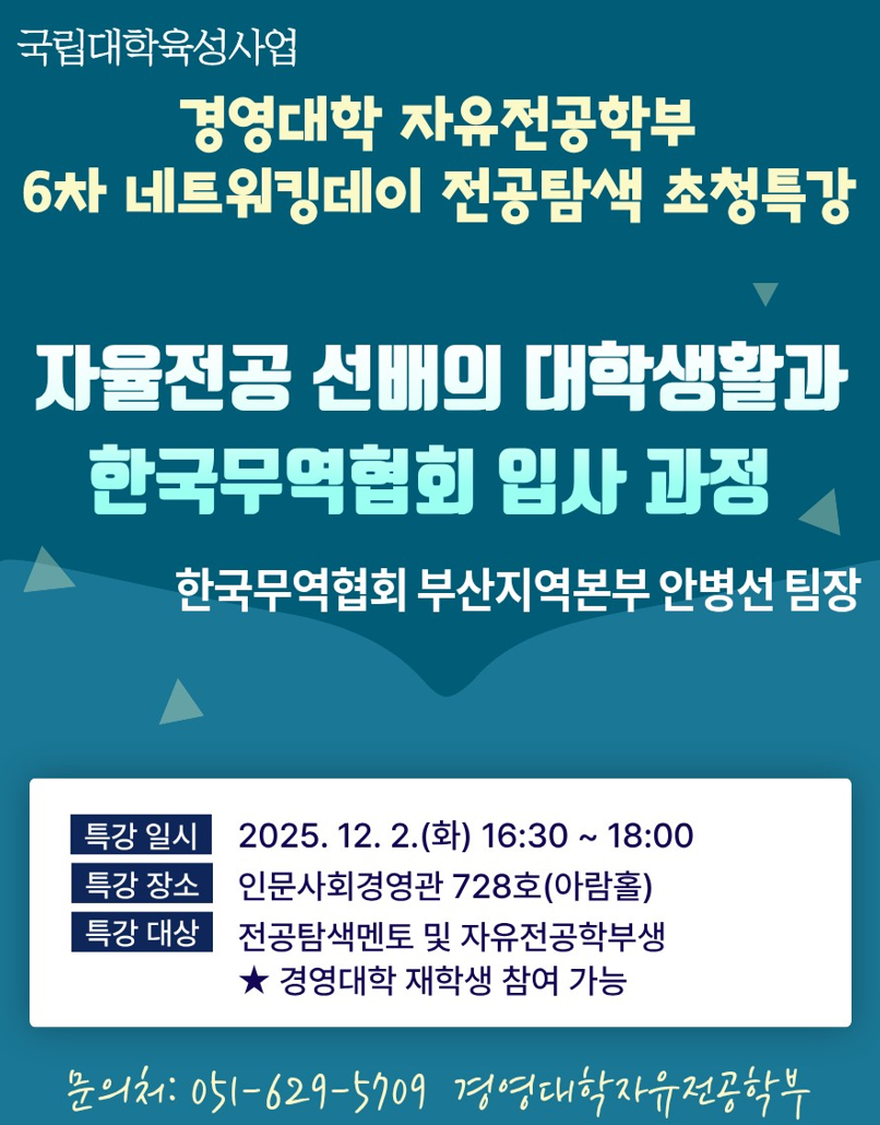 경영대학 자유전공학부 6차 네트워킹데이 전공탐색 초청특강을 아래와 같이 안내하오니 많은 참석 바랍니다. 1. 일시: 2025. 12. 2.(화) 16:30~18:00 2. 장소: 인문사회경영관 728호(아람홀) 3. 대상: 전공탐색멘토 및 자유전공학부생 (경영대학 재학생 참여가능) 4. 특강주제: "자율전공 선배의 대학생활과 한국무역협회 입사 과정" 5. 초청강사: 한국무역협회 부산지역본부 안병선 팀장