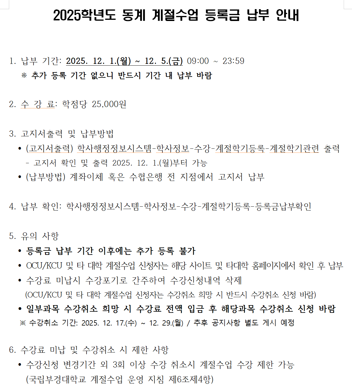 2025학년도 동계 계절수업 등록금 납부와 관련하여 아래와 같이 안내드리오니 학생들은 기간 내 납부하여 주시기 바랍니다. 가. 등록 기간: 2025. 12. 1.(월) ~ 12. 5.(금) 09:00 ~ 23:59 ※ 추가 등록 불가 나. 수 강 료: 학점당 25,000원 다. 등록 방법: 개인별 가상계좌 입금(고지서 납부 또는 계좌이체) 라. 납부 확인: 학사행정정보시스템-학사정보-수강-계절학기등록-등록금납부확인 마. 유의 사항 - OCU/KCU 및 타 대학 계절수업 신청자는 해당 사이트 및 타 대학 홈페이지에서 확인 - 등록 기간 내 수강료 미납부시 수강신청내역 삭제 처리 - 일부과목 수강취소 희망 시 수강료 전액 입금 후 해당과목 수강취소 신청 바람 ※ 수강취소 기간: 2025. 12. 17.(수) ~ 12. 29.(금) - 수강신청 변경기간 외 3회 이상 수강 취소한 학생은 계절수업 수강 제한