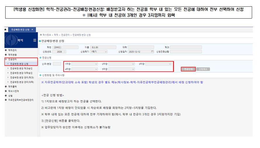 1. 신청대상: 2026-1학기 기준 2학년 1학기 (3학기) 재학생 (2025-2학기 포함 이수 학기가 2학기인 학생) 2. 전공배정 신청 시 아래의 학생신청 화면 참고하여 신청(※ 1지망, 2지망, 3지망까지 반드시 입력해야 함.) 3. 2025-2학기 최종 성적 확정 후 전공배정 선발, 선발 후 알림 공지 예정(성적 평점평균에 따라 선발)