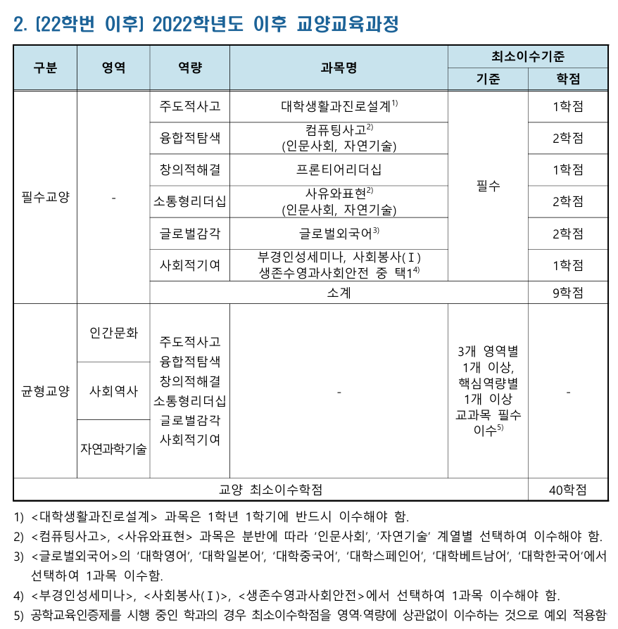 ※ 졸업불가사유에 ※교양역량영역 미이수 적혀 있는 학생은 아래의 표를 확인하여 본인이 이수해야 하는 교양학점을 모두 충족하였는지 확인 바랍니다. 본인의 교양과목 이수 내용은 학사행정정보시스템>졸업>교양이수관리>교양이수확인에서 확인 가능합니다.