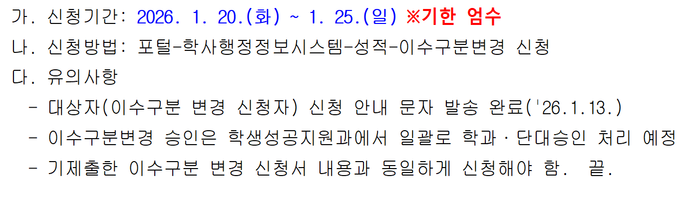 2025-동계 도전과혁신창업 교과목 이수구분변경 포털 신청 안내