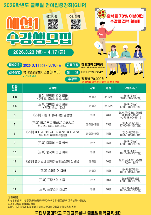 | 첨부파일 | (붙임1) 2026학년도 글로벌 언어집중강좌(GLIP) 세션1 모집 안내문(3.10).pdf (붙임2) 강의계획서.zip (붙임3) 온라인 수강신청 메뉴얼.pdf (붙임4) 글로벌언어집중강좌(GLIP) 취소 및 변경신청서.hwp | ||
