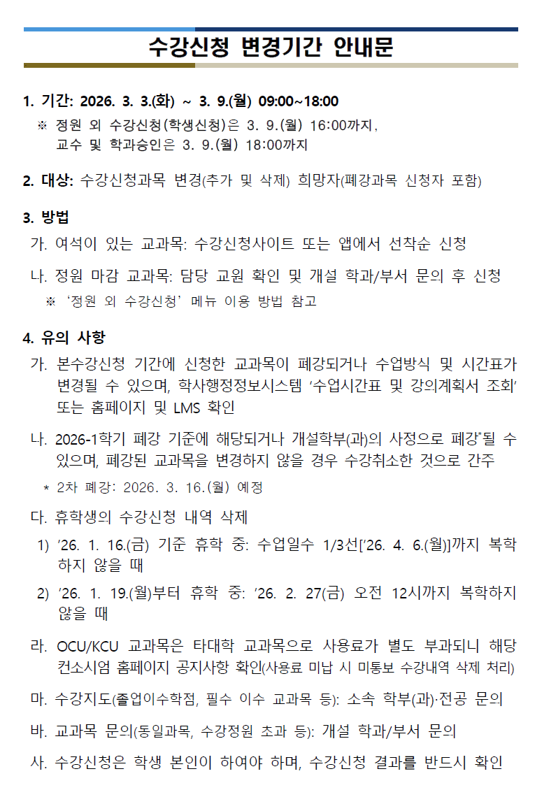 2026-1학기 학부 수강신청 변경기간 안내