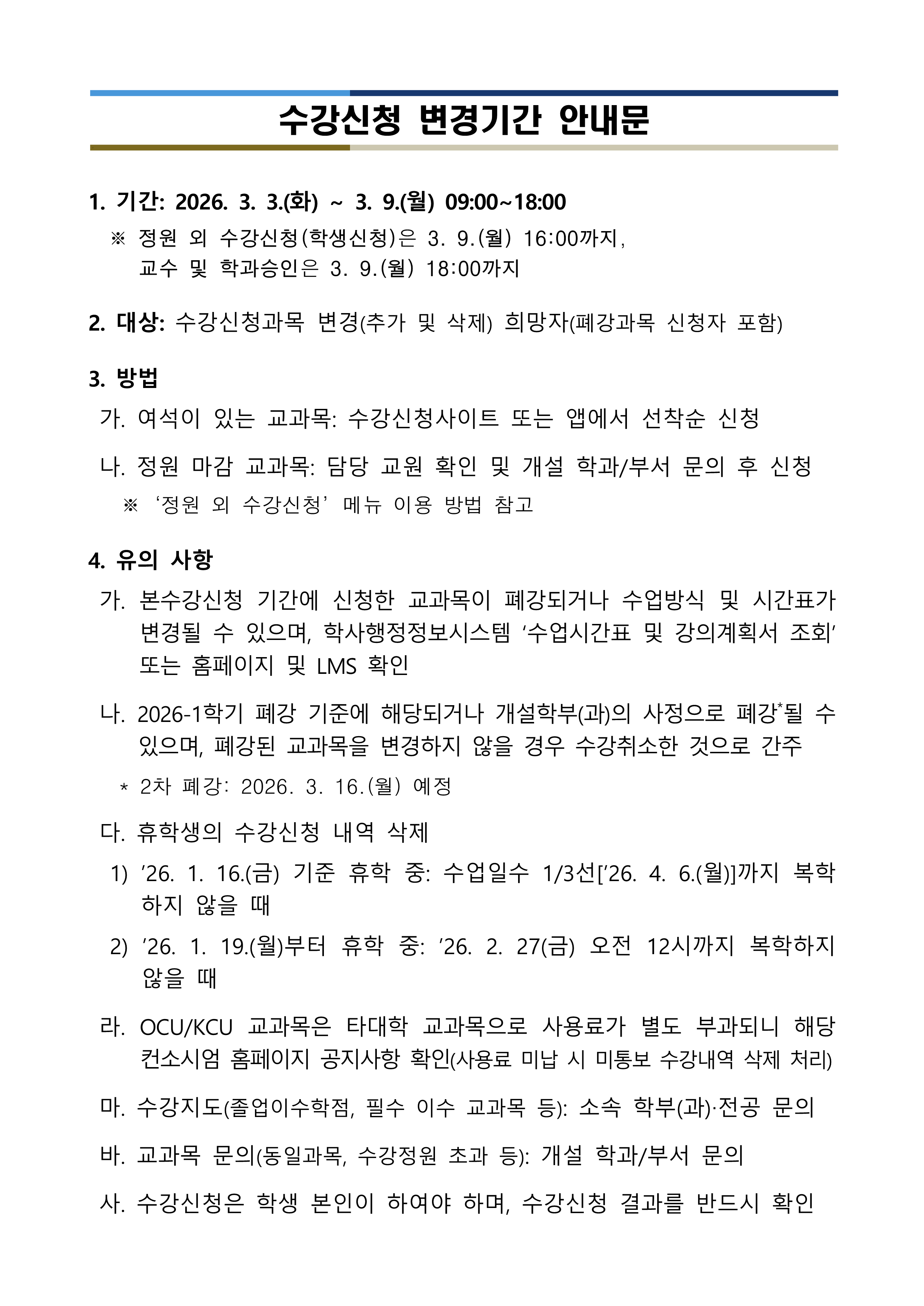 | 2026-1학기 학부 수강신청 변경기간(3/3(화)~3/9(월)) 및 정원 마감 전공교과목 학생신청 방법 안내 | |||