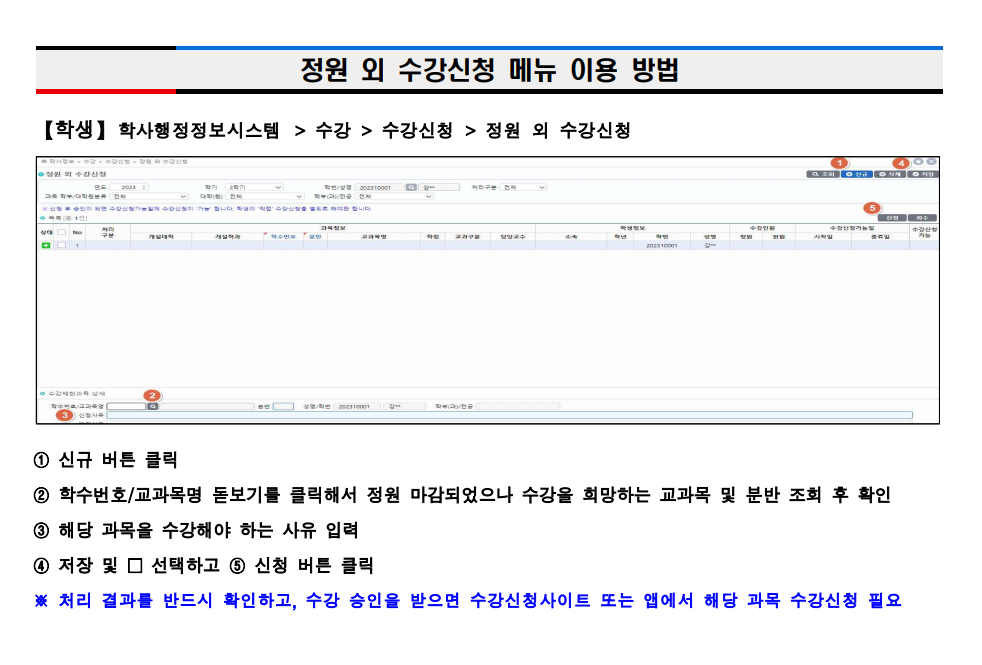 정원 외 수강신청 관련 안내 1. 조교에게 먼저 문의(law20@pknu.ac.kr) 2. 학생이 교수님께 메일 등으로 사전에 허락을 구한다. 3. 아래의 방법대로 포털에서 '정원 외 수강신청'을 하고, 조교에게 개별 연락을 한다. 4. 교수님이 승인하면 학생이 개별 신청