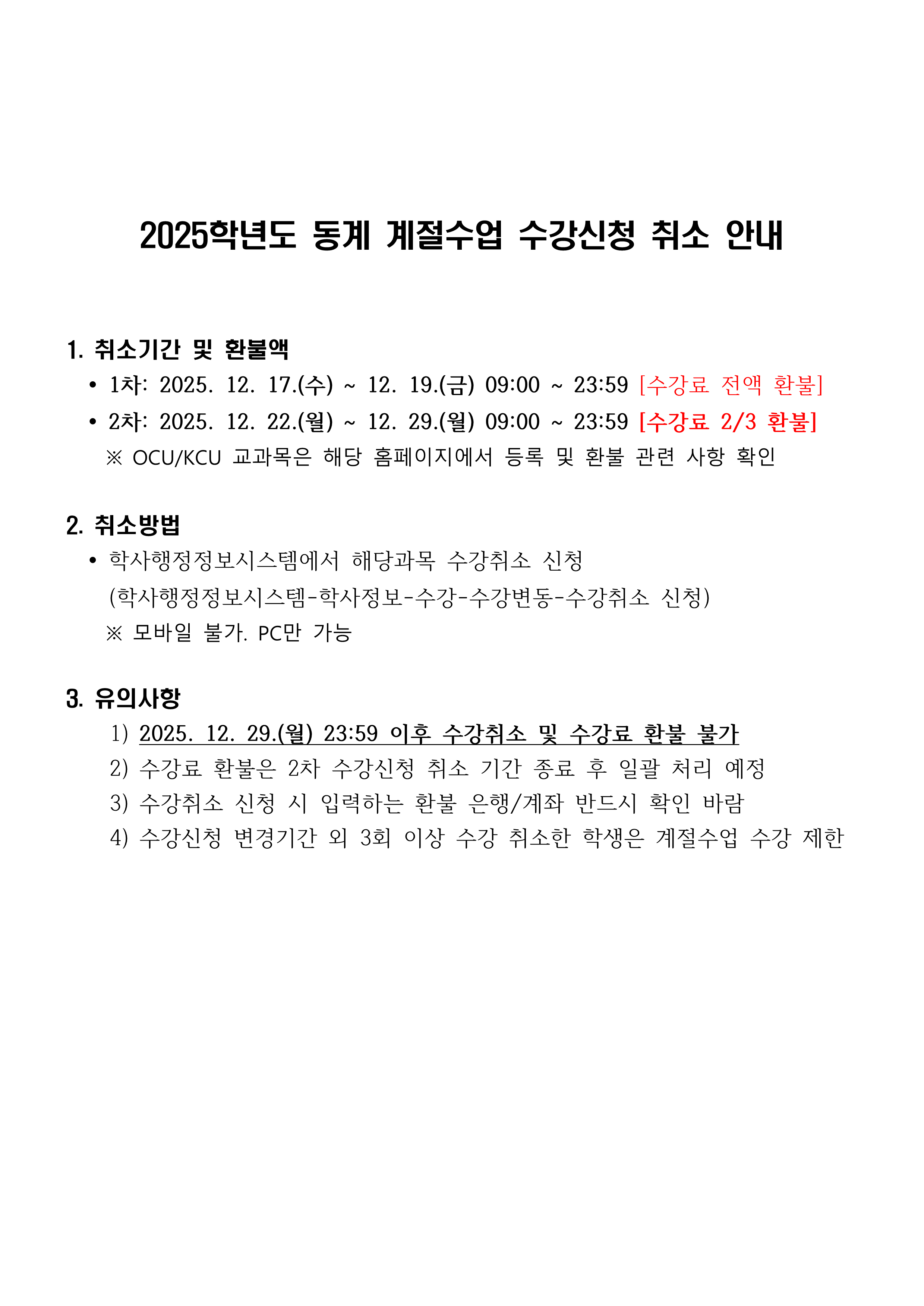 2025학년도 동계 계절수업 수강신청 취소 안내