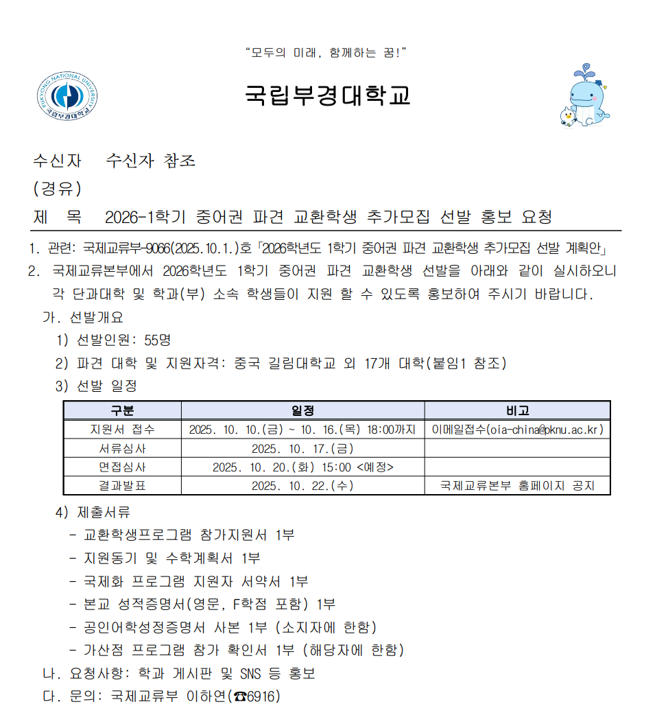 2026-1학기 중어권 파견 교환학생 추가모집 안내
