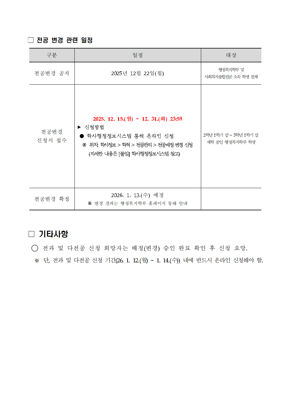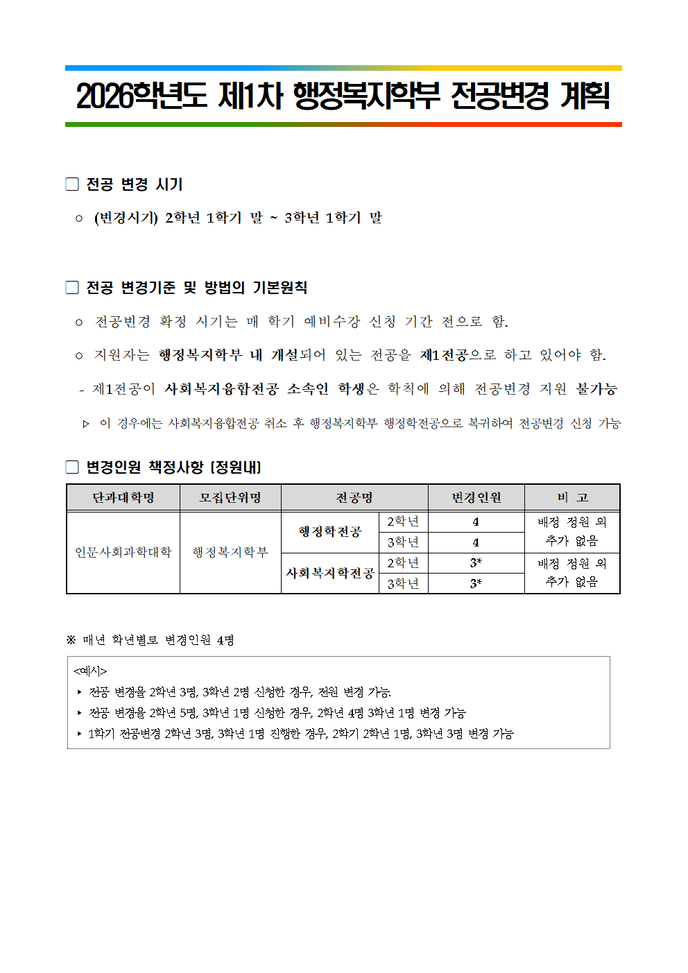 2026학년도 제1차 행정복지학부 전공변경 계획