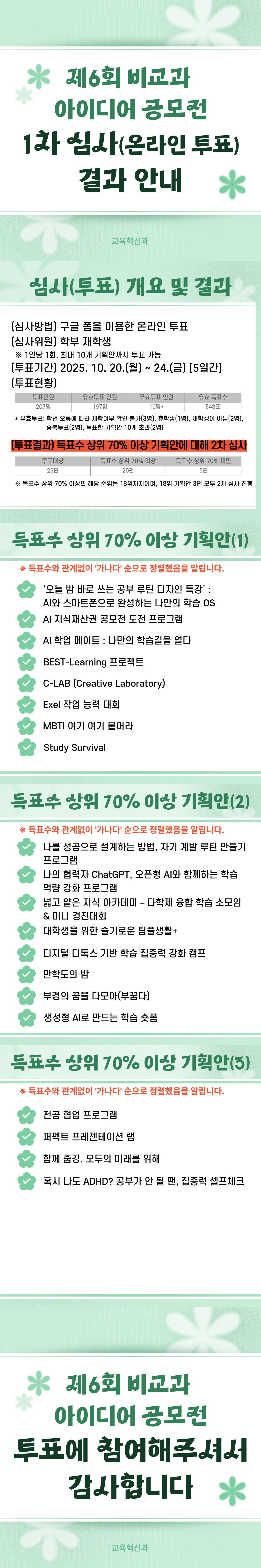 아이디어에서 진행한 프로젝트로 참여한 '제 6회 비교과 아이디어 공모전'에서 윤은택 학생의 '대학생을 위한 슬기로운 팀플생활+' 김다은, 임예지, 김수연 학생팀의 'EXCEL 작업능력 대회' 윤지원 학생의 '디지털 디톡스 기반 학습 집중력 강화 캠프' 가 1차 심사를 통과했습니다. 이후, 최종 수상까지 간 기획안은 없었지만 이를 통해 다양한 공모전을 준비할 수 있는 기반이 될 수 있었으면 합니다. |