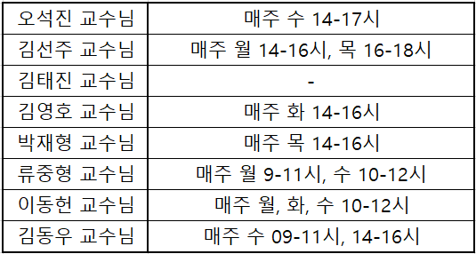 정기상담을 실시하고자 아래와 같이 상담 가능 일시를 안내하오니 관심이 있는 학생들은 교수님들께 lms쪽지 또는 조교에게 연락하여 상담 가능여부를 확인하고 희망하는 시간대에 상담을 받으시기 바랍니다.