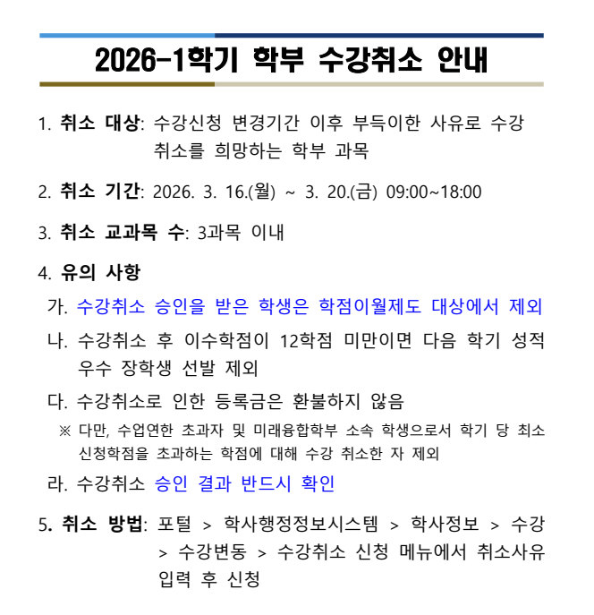 2026-1학기 학부 수강취소 기간 및 방법 안내