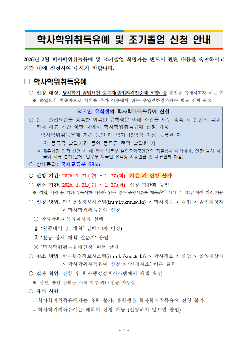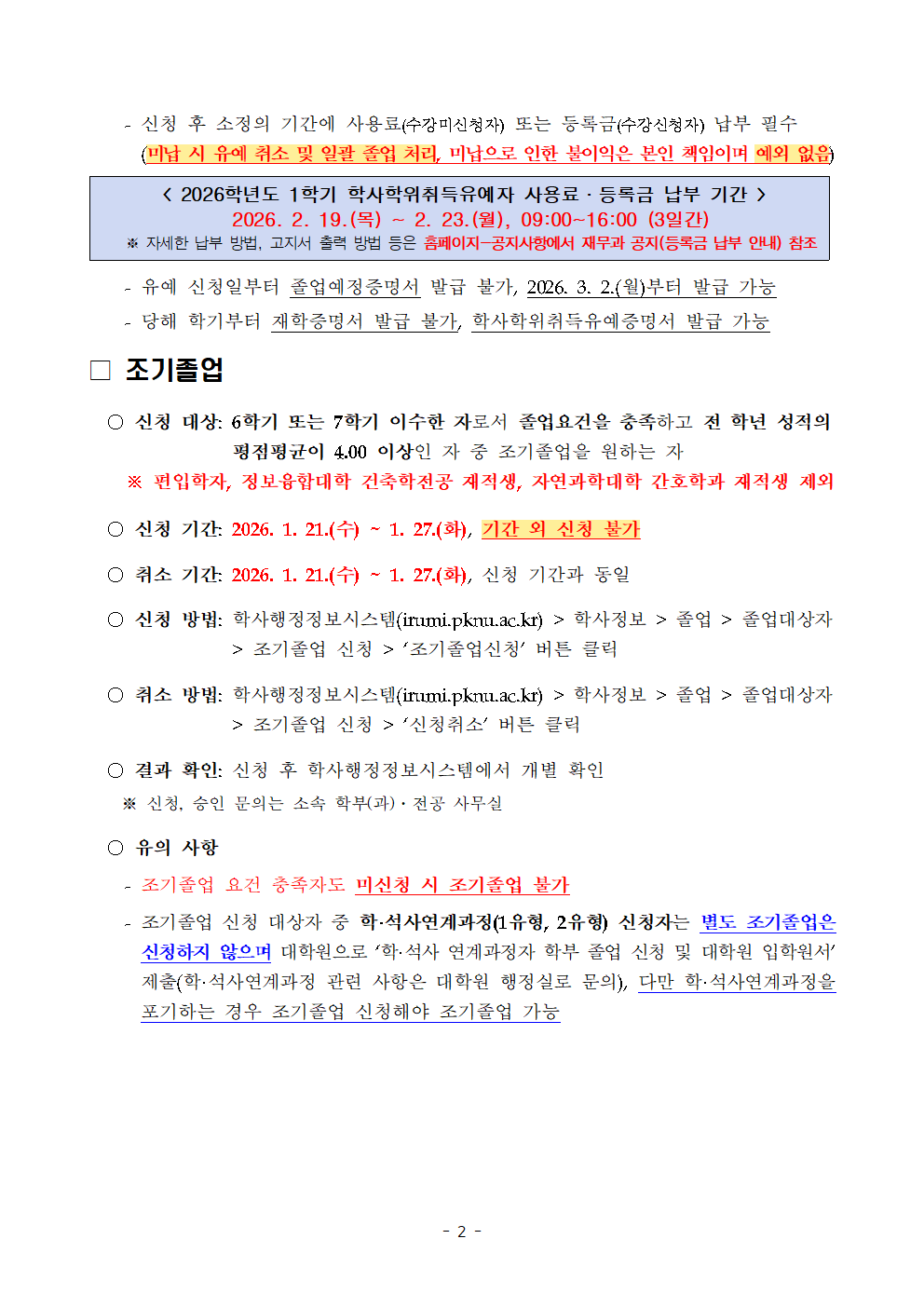 2026년 2월 학사학위취득유예 및 조기졸업 계획 알림