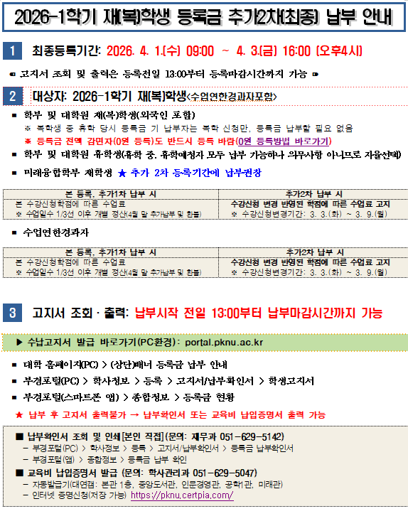 | 2026학년도 1학기 재(복)학생 등록금 추가2차(최종) 납부 안내 | |||