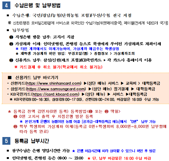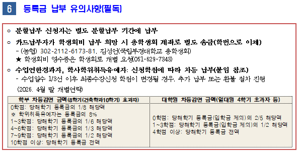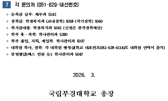 | 첨부파일 | (붙임5)2026학년도 신청학점별 차등감면 등록금 내역(수업연한경과자).xls (붙임1)2026-1학기 재(복)학생, 재입학생 등록금 납부 안내.hwp (붙임2)등록금 고지서 조회방법 안내.pdf (붙임4)2026학년도 등록금 내역(국립부경대학교).xlsx | ||