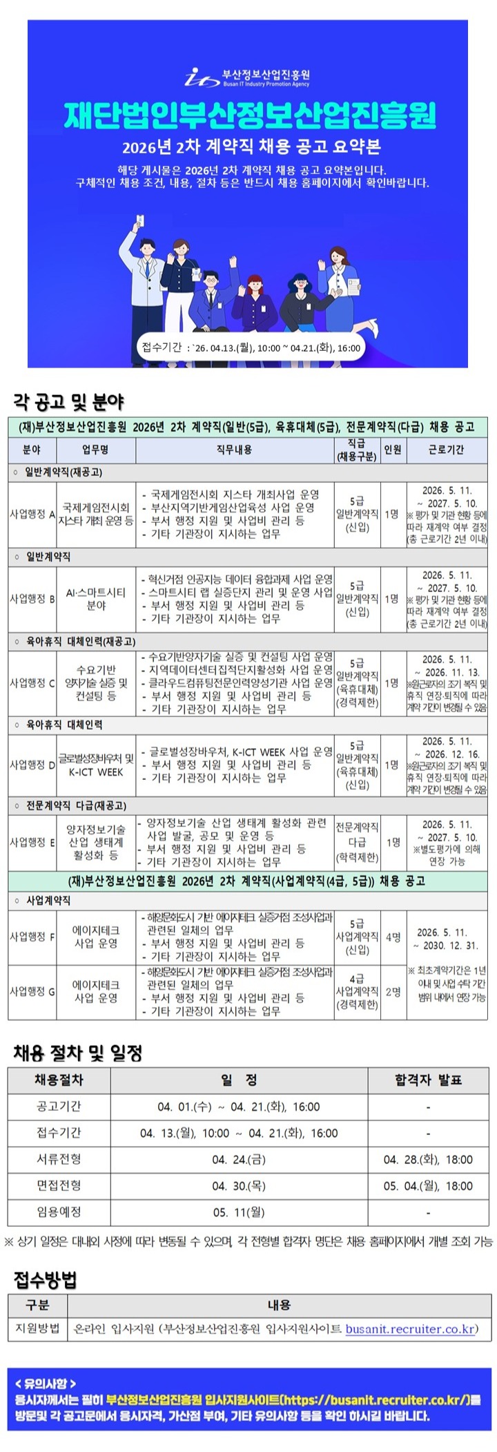 <게시 내용> ○ (재)부산정보산업진흥원 2026년 2차 계약직 채용 공고 - 접수기간 : 2026. 04. 13.(월), 10:00 ~ 04. 21.(화), 16:00 - 공고내용, 접수방법, 채용절차는 아래 사이트에서 확인 바랍니다. ☞ (재)부산정보산업진흥원 채용 사이트(https://busanit.recruiter.co.kr)