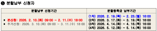 | 첨부파일 | 2026학년도 분할납부 등록금 내역.xls 2026학년도 신청학점별 차등감면 등록금 내역(수업연한경과자).xls 등록금 고지서 조회방법 안내.pdf | ||