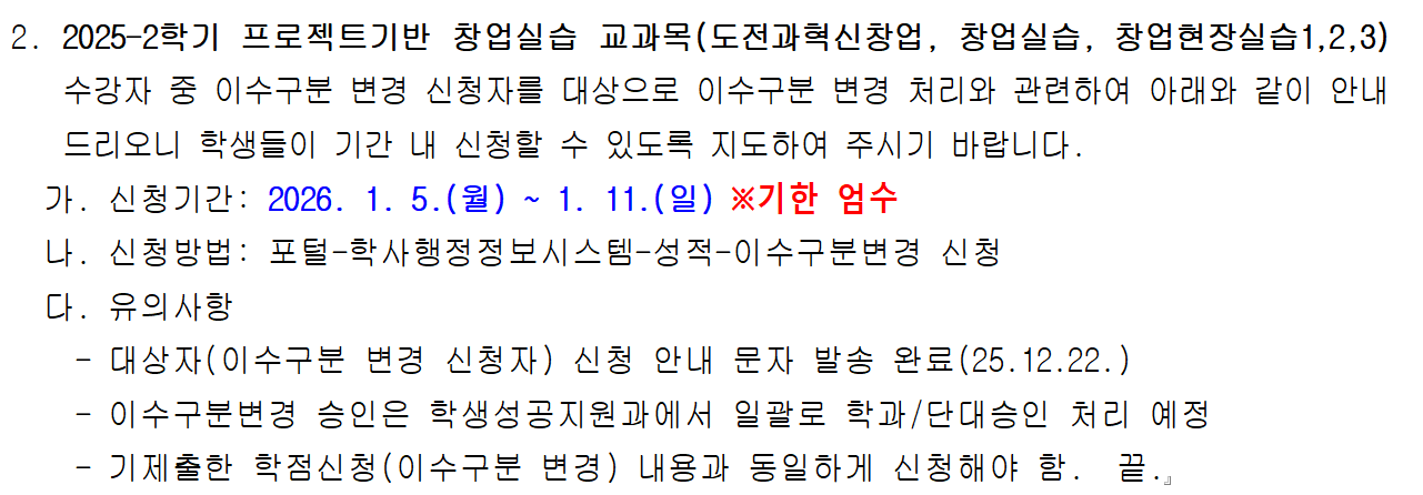 2025-2학기 프로젝트기반 창업실습 교과목(도전과혁신창업 등) 수강자 중 이수구분 변경 포털신청을 아래와 같이 안내 드리오니 해당되는 학생은 기한에 맞춰 신청하시기 바랍니다.