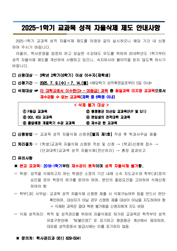 | 2025-1학기 교과목 성적 자율삭제 시행 안내(~7/14) | |||