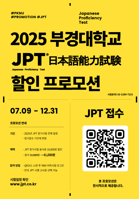 | 국립부경대학교 재적생(대학원생 포함) JPT 일본어 정기시험 프로모션 할인 제공 안내(~25/12/31) | |||