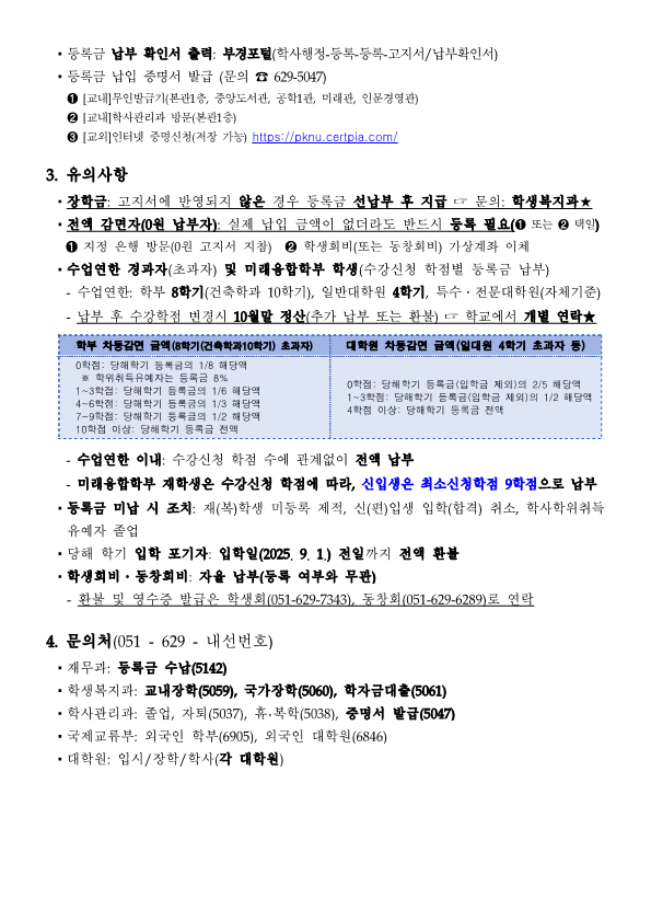 | 첨부파일 | (붙임2)2025학년도 등록금 내역(국립부경대학교).xlsx (붙임3)2025학년도 분할납부 등록금 내역.xls (붙임4)2025학년도 신청학점별 차등감면 등록금 내역(수업연한경과자).xls (붙임5)2025학년도 학부 및 (특수전문)대학원 계열분류표.xlsx (붙임6)2025-2학기 등록금 수납 일정(요약).hwp (붙임7)휴학자 등록금 반환신청서(서식).hwp | ||