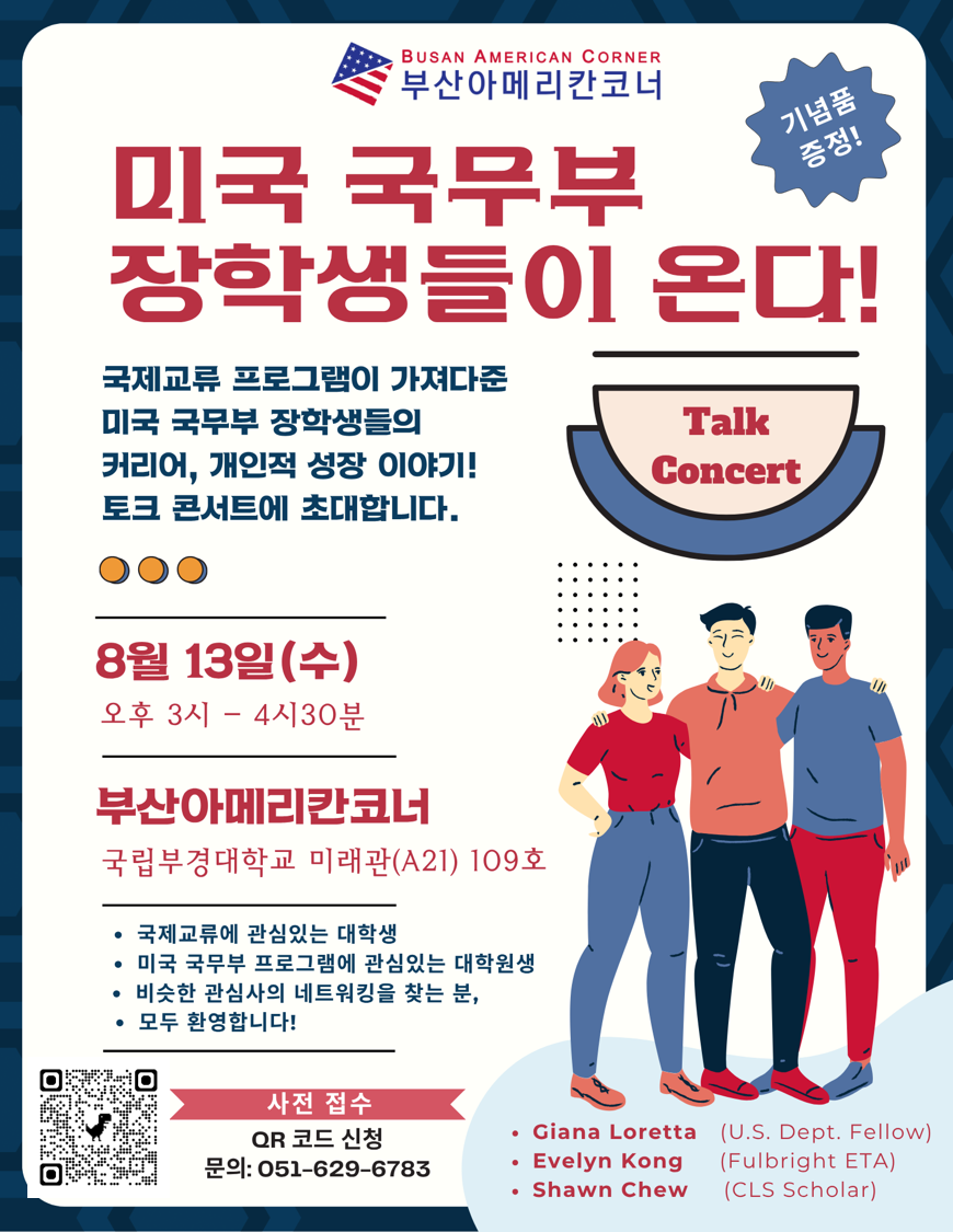 글로벌어학교육센터는 주한미국대사관과의 공동 주관으로「외교관 초청 프로그램」을 아래와 같이 개최하오니, 관심있는 학생들의 많은 참여바랍니다. □ 프로그램 개요 ○ 행사명: 외교관 초청 프로그램 (미국외교관과 소통하며 글로벌 역량을 키울 수 있는 행사) ○ 일 시: 2025. 8. 13.(수) 15:00 ~ 16:30 ○ 장 소: 부산아메리칸코너(대연캠퍼스 미래관 1층, 109호) ○ 강연주제: Professionnal & Personal Benefits of Participating International Exchange Program ○ 강연자: Giana Loretta (U.S State Department Rangel Fellow) 등 3명 □ 신청방법: 사전 신청 필요 ※ 구글 폼을 활용한 QR코드 접속 & 신청 (QR코드: 붙임의 행사 포스터 하단 참조)