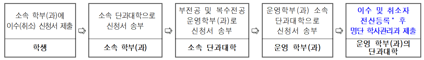 부전공 및 복수전공 학점취득 등 졸업요건이 미충족된 학생의 경우, 다전공 취소 및 복수전공 > 부전공으로 변경이 가능합니다. 아래 내용을 확인하시어 희망자는 기한 내 신청하시길 바랍니다. 가. 대상: 전공 및 복수전공 학점취득 등 졸업요건이 미충족된 학생 나. 제출서류: - 부전공 및 복수전공 취소: 이수 포기서 제출[붙임4] - 복수전공을 부전공으로 변경: 복수전공 이수 포기서[붙임4] 및 부전공 이수 신청서[붙임3] 제출 다. 제출기한: ~ 2025. 10. 12.(일)까지 마. 처리 절차