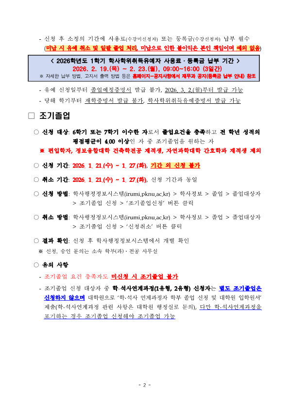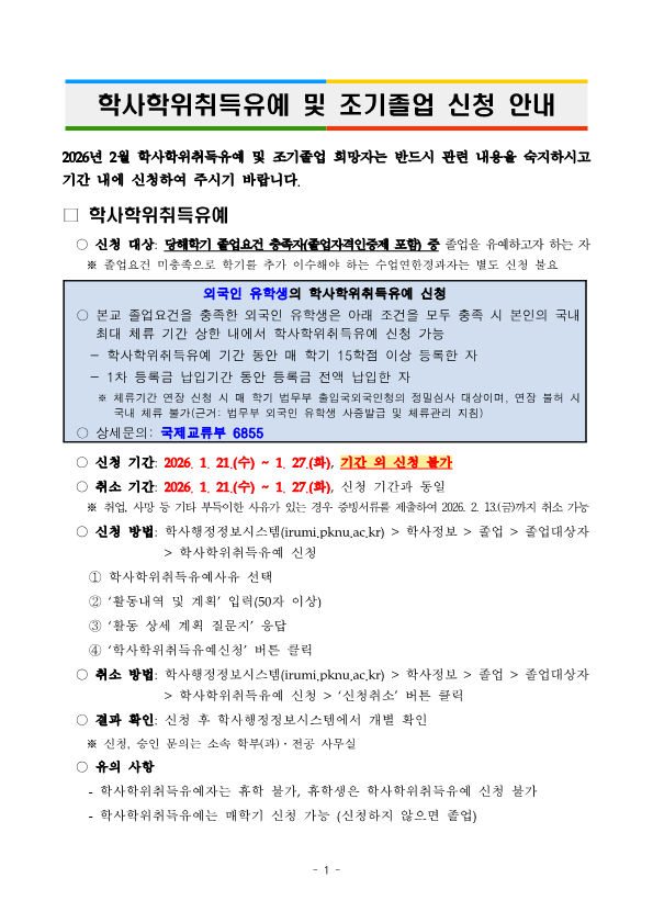2026년 2월 학사학위취득유예 및 조기졸업 계획을 다음과 같이 안내하오니, 희망하는 학생은 기간 내 신청하시길 바랍니다. 가. 신청기간: 2026. 1. 21.(수) ~ 1. 27.(화), 기간 외 신청 불가 나. 신청방법: [붙임2] 학생 안내문 참조(학사행정정보시스템에서 신청)