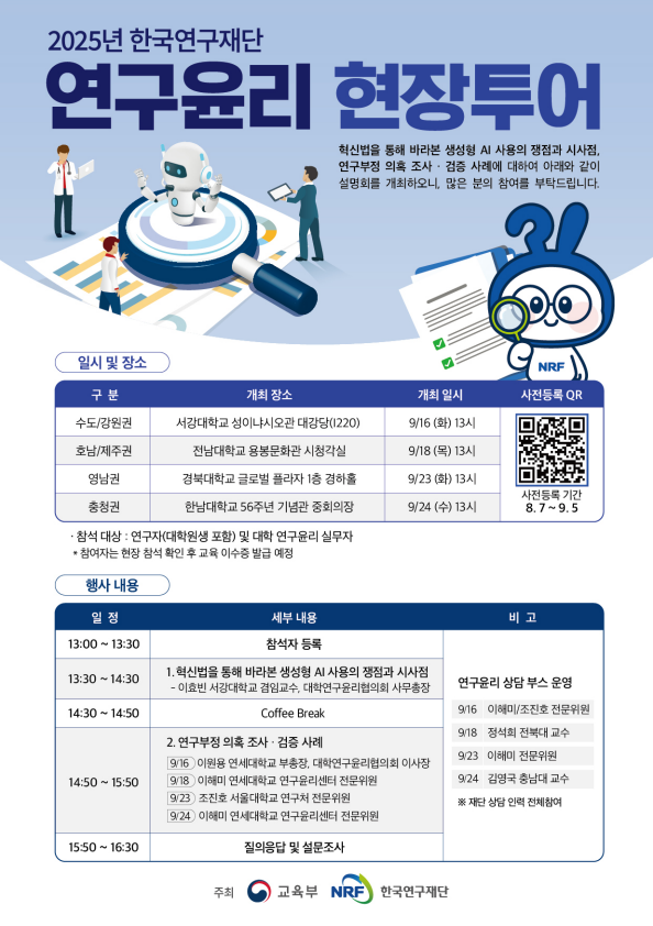 가. 행사 개요 ○ 행사명: 2025년 한국연구재단 연구윤리 현장투어 ○ 참석 대상: 대학 연구윤리 실무자 및 연구자(대학원생 포함) ○ 주요 내용: 혁신법을 통해 바라본 생성형 ai 사용의 쟁점과 시사점, 연구부정 의혹 조사ㆍ검증 사례 교육 등 ○ 일자 및 장소: 9.16.(화)~24.(수) / 전국 4대 권역 소재 대학
