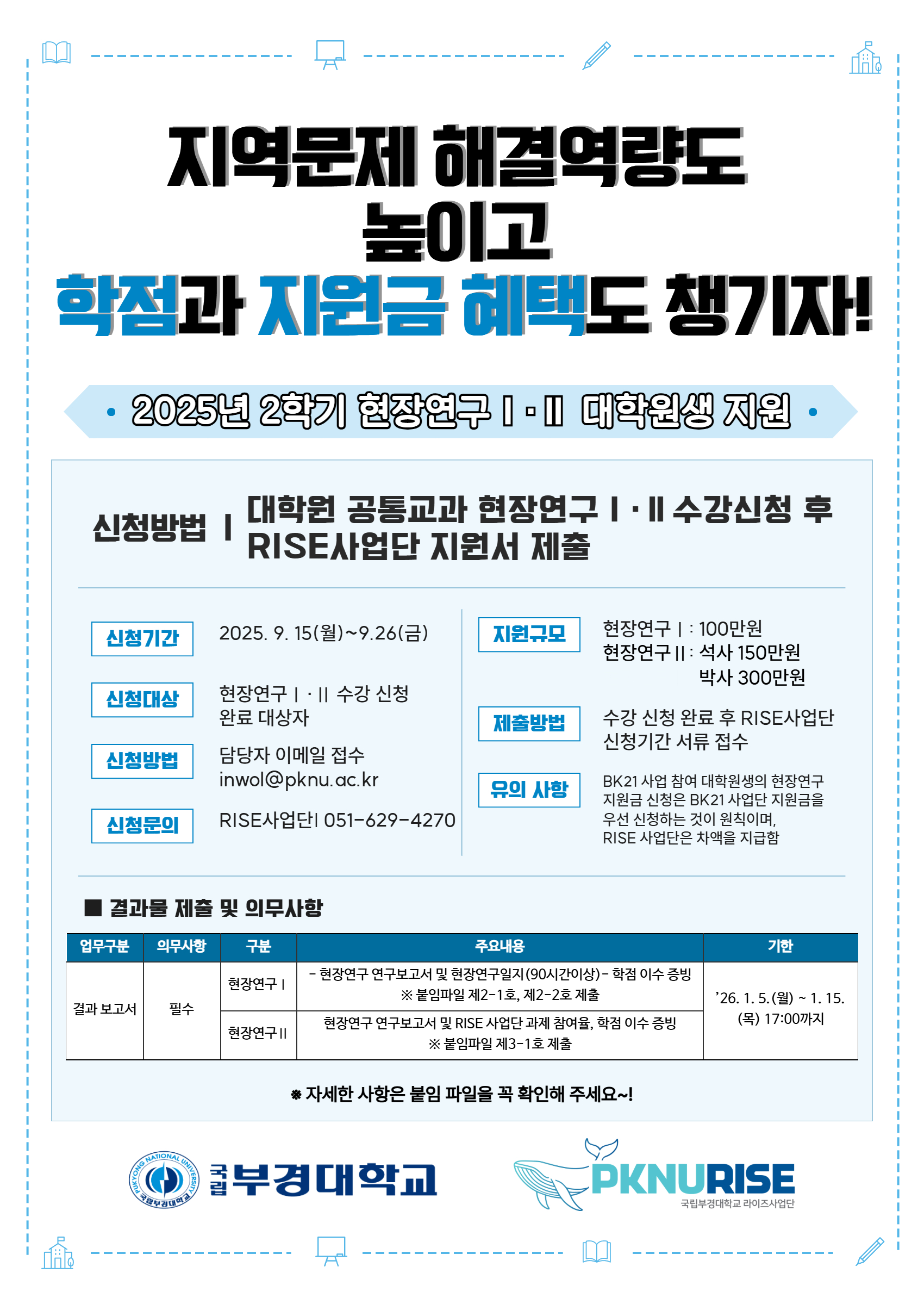 2025학년 2학기부터 대학원 현장연구 교과목 활성화를 위한 대학원생 대상 지원 사업을 운영하오니 신청 희망자는 기한 내 신청해주시기 바랍니다. 가. 추진개요 1) 사 업 명: 2025학년도 2학기 대학원 현장연구 Ⅰ·Ⅱ 교과목 현장연구 지원사업 2) 사업목적: 현장연구 과목 체득을 통한 대학원생 실무 역량 강화 및 체계적 현장연구 역량 배양 2) 지원대상: 대학원 현장연구 Ⅰ·Ⅱ 수강생 중 RISE 사업단 지원자 3) 지원규모: 현장연구Ⅰ 각 100만원, 현장연구Ⅱ 각 300만원 ※ BK21 사업 참여 대학원생의 현장연구 지원금 신청은 BK21 사업단 지원금을 우선 신청하는 것이 원칙이며, RISE 사업단은 차액을 지급함 나. 신청접수 1) 신청기간: 2025. 9. 15.(월) ~ 9. 26.(금) 2) 신청방법: 담당자 이메일 접수 3) 제출서류: 붙임파일 서식(제1호, 제1-1호, 제2호, 제3호), 재학증명서 4) 제출 및 문의: inwol@pknu.ac.kr / (문의처) 051-629-4270