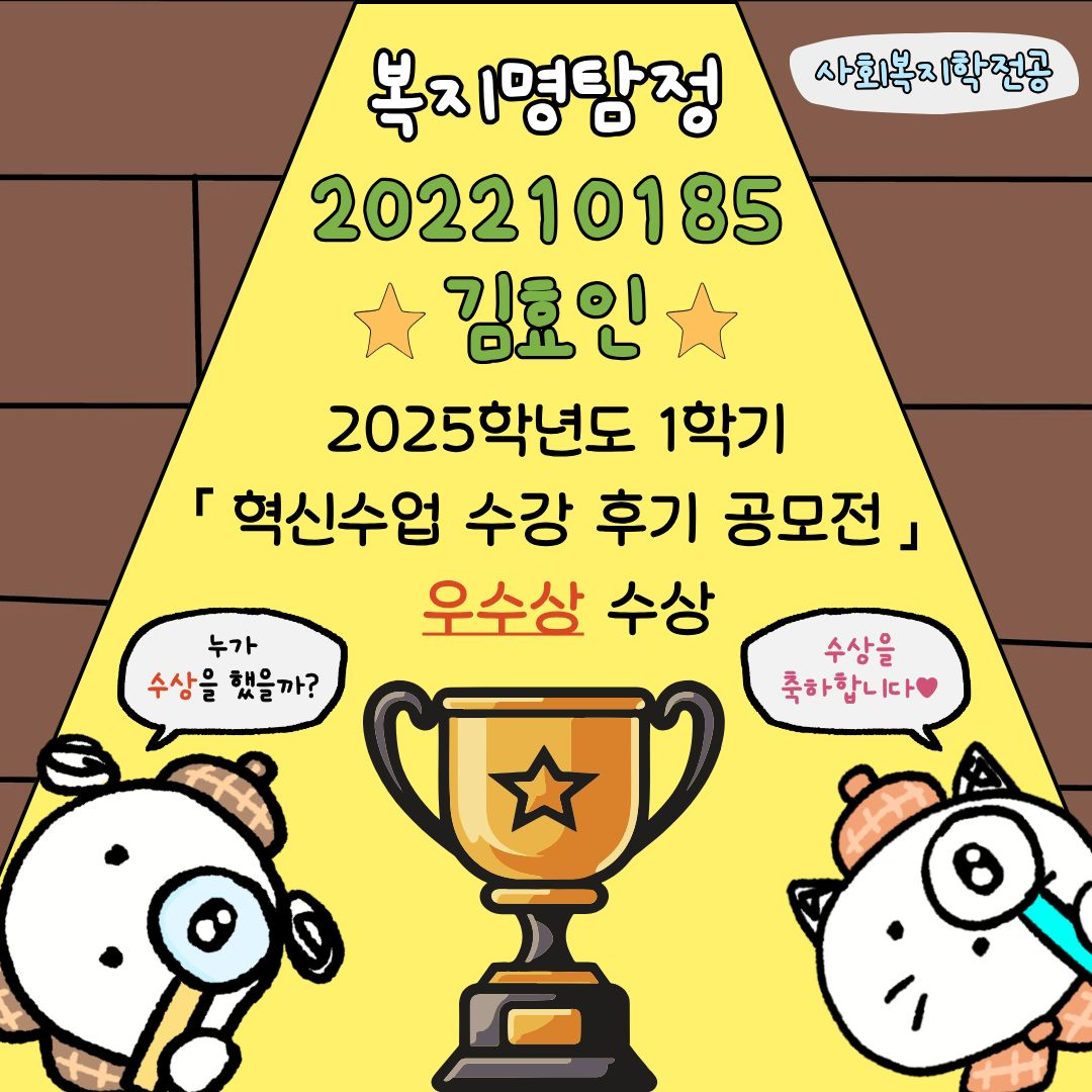 사회복지학전공 김효인 학우가 <2025-1학기 혁신수업 수강 후기 공모전>에서 우수상을 수상하였습니다. 축하합니다:)