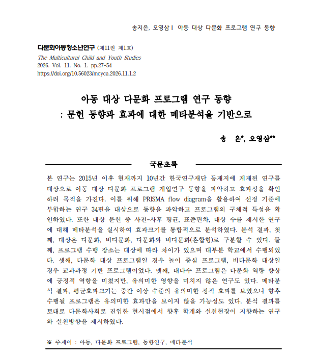 | [논문게재]「아동 대상 다문화 프로그램 연구 동향: 문헌 동향과 효과에 대한 메타분석을 기반으로」 | |||