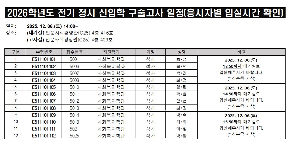 | 첨부파일 | 2026학년도 전기 사회복지학과 구술고사 일정(응시자별 입실시간 확인).xlsx | ||