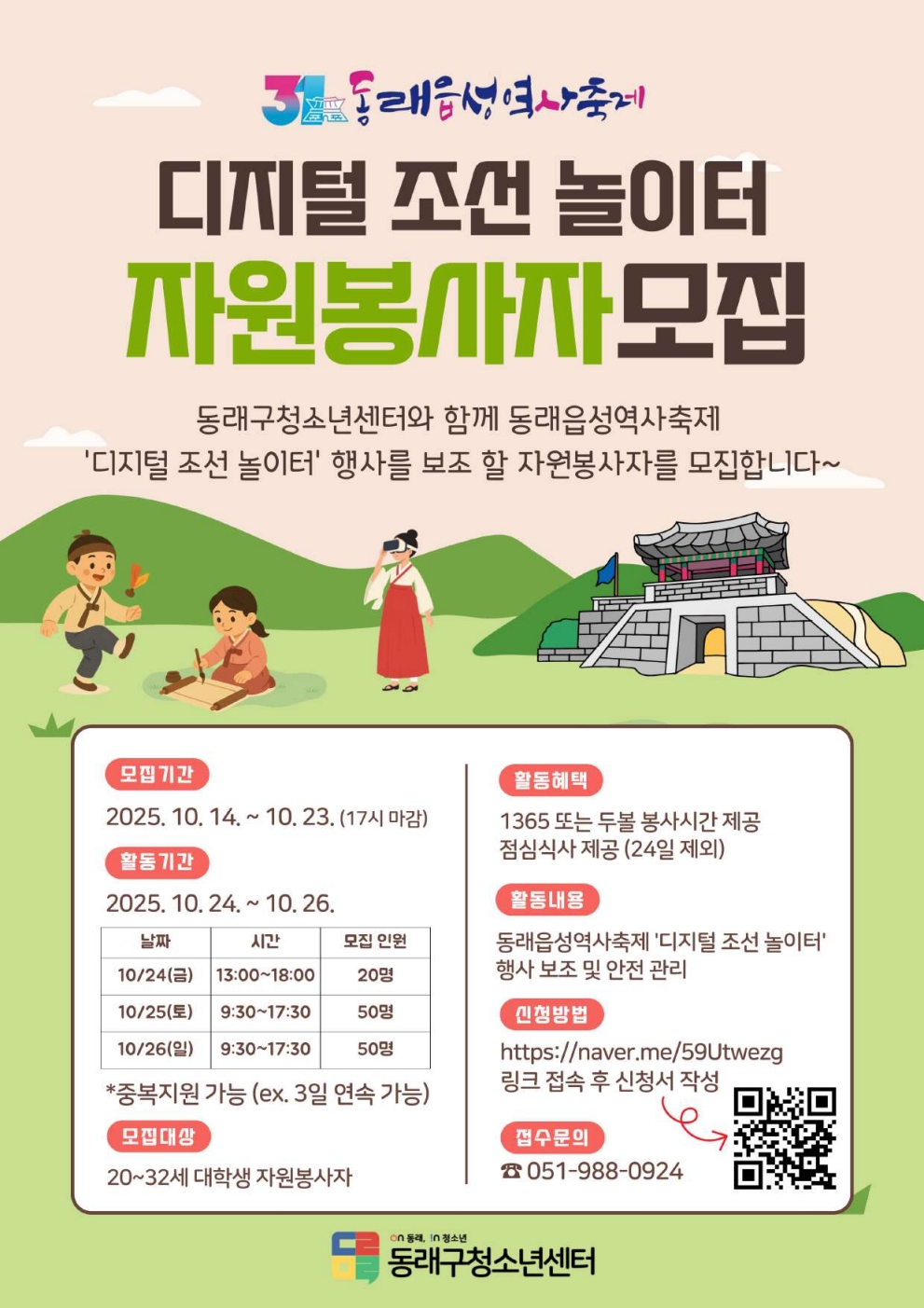 동래구청소년센터에서 제31회 동래읍성역사축제와 연계하여 진행하는 '디지털조선놀이터' 자원봉사자를 모집합니다. 학생들의 많은 관심과 참여 바랍니다. 가. 모집기간 : 2025. 10. 14. ~ 10. 23. (17시 마감) 바.신청방법 : 해당 링크(https://naver.me/59Utwezg) 접속 후 신청서 작성 사. 문의: 051-988-0924 ※ 자세한 사항은 아래 포스터 참조