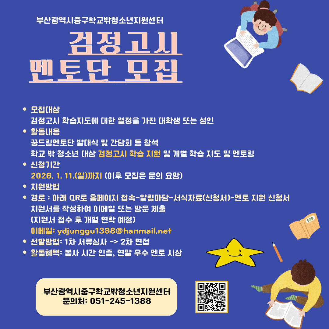 현재 부산광역시중구 학교밖청소년지원센터에서 검정고시 멘토단을 아래와 같이 모집하고 있으니, 관심있는 학생들은 신청바랍니다.