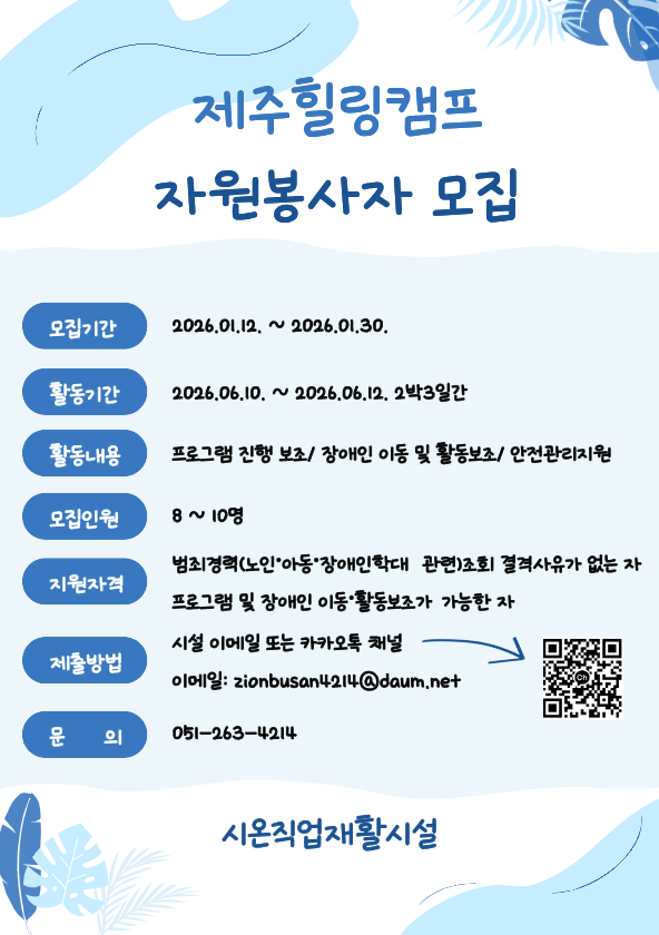 | [자원봉사] 시온직업재활시설 | 발달장애인 자립 성장 프로젝트 - 제주힐링캠프 봉사자 모집 안내 | |||