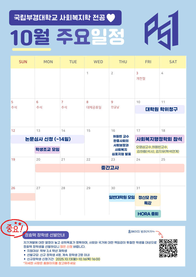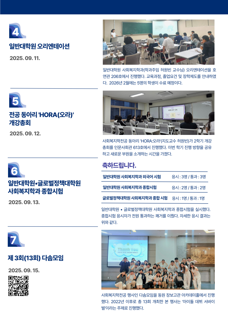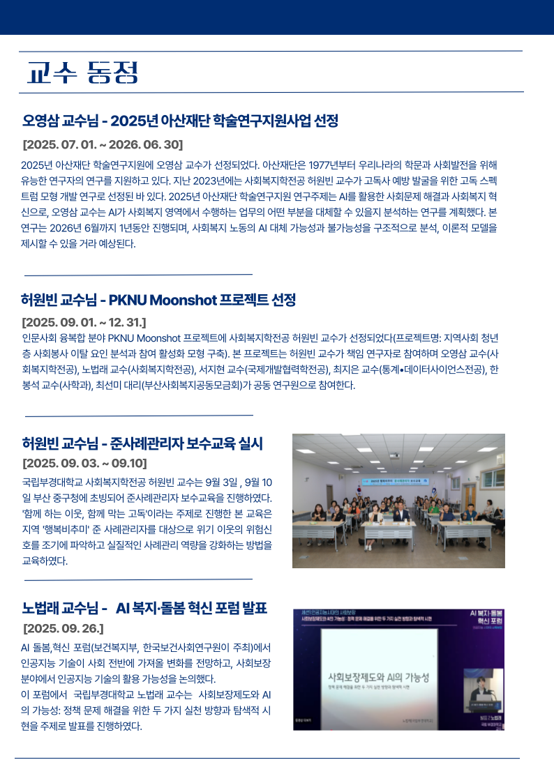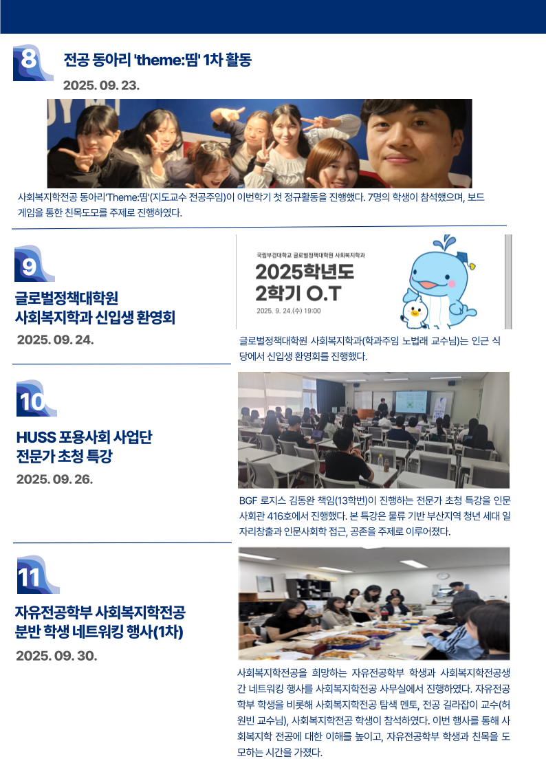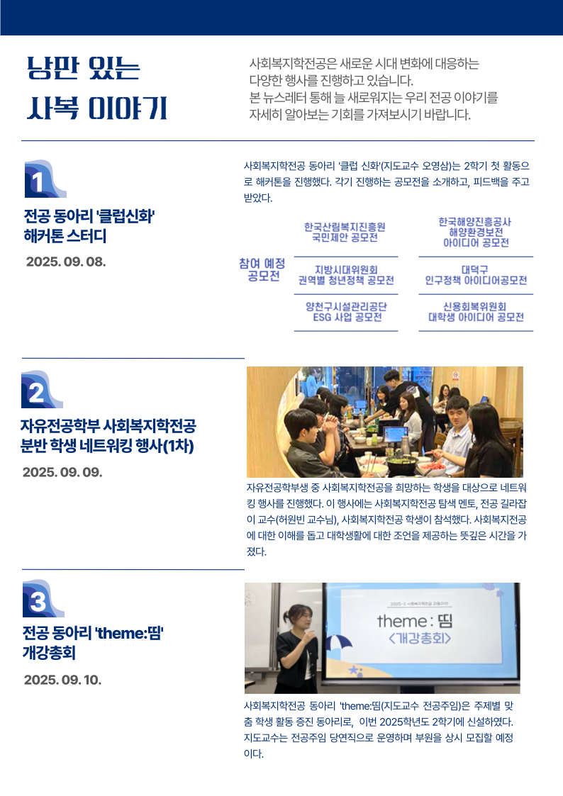 [사회복지학전공 및 대학원 뉴스레터 발행] 안녕하세요. 사회복지학전공에서는 이번 달부터 전공 및 대학원(일반대학원, 글로벌정책대학원) 관련 소식을 담은 정기 뉴스레터를 매월 또는 격월로 발행할 예정입니다. 뉴스레터에는 전공소식,대학원 소식, 학술행사 및 정보,교수동정,전공동정등 다양한 다양한 소식이 포함될 예정입니다. 이번 2025년 9월호 뉴스레터에는 사회복지학전공과 대학원의 다양한 소식과 정보를 담았습니다. 자세한 내용은 아래 첨부파일을 참고해주시기 바랍니다