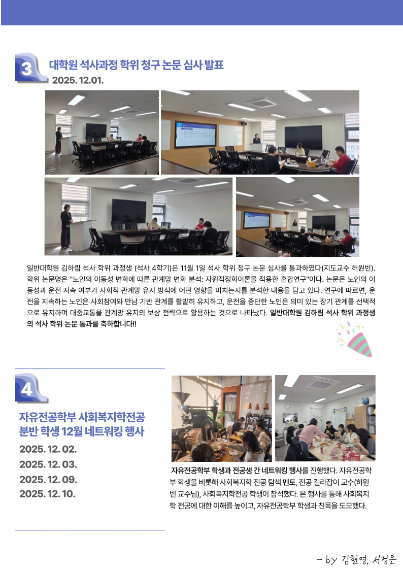 [사회복지학전공 및 대학원 뉴스레터 발행] 안녕하십니까. 12월호 뉴스레터를 발행했습니다. 전공 소식, 교수 동정, 대학원 정보, 학과 행사 등 다양한 소식이 담겨있으니 많은 관심 부탁드립니다. 자세한 내용은 첨부 파일에서 확인 가능합니다. 감사합니다.